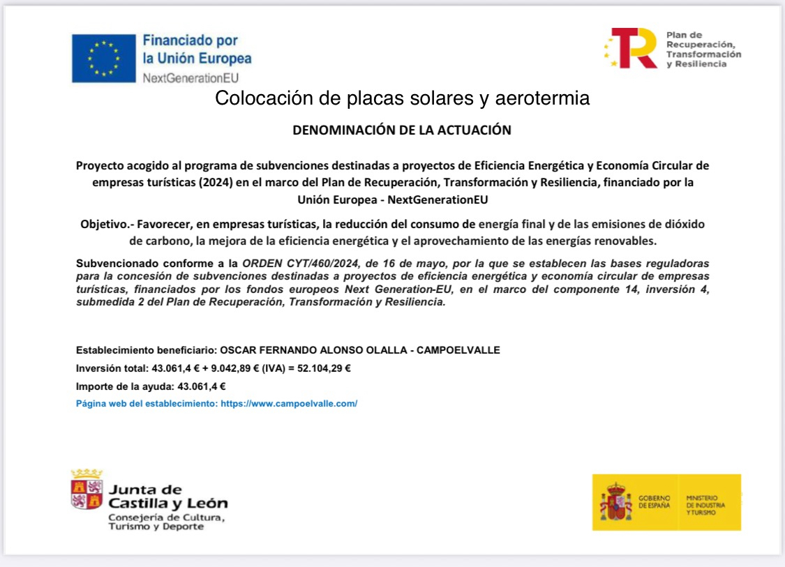 La casa Campoelvalle para 14 + 2 personas dispone de 6 habitaciones, cinco dobles con posibilidad de camas supletorias y una habitación triple, todas ellas con su televisión, baño y conexión a Internet. Podrán disfrutar en común de un amplio salón, comedor, terraza y jardín. La casa tiene vistas a Campo El Valle, el paraje natural que da nombre a la casa.